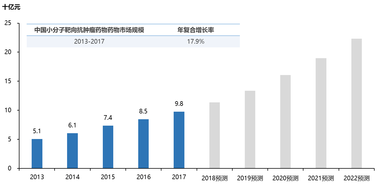 中國小分子靶向抗腫瘤藥物市場規(guī)模,2013-2022年(預(yù)測)