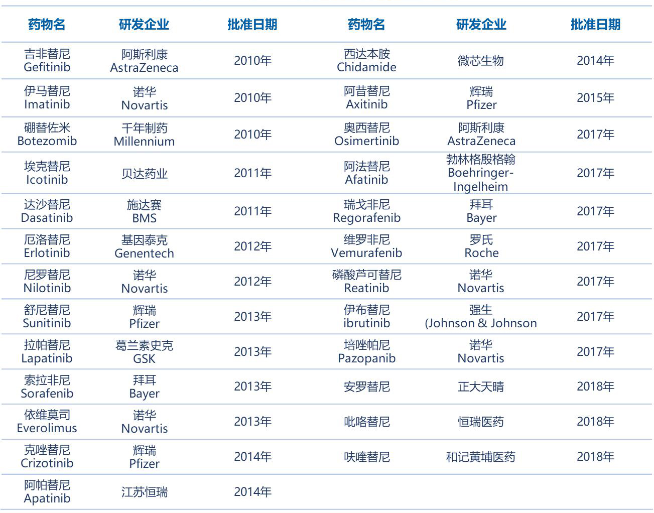 中國批準(zhǔn)上市的小分子靶向抗腫瘤藥物,截至2018年