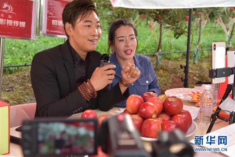 工作人員在云南昭通蘋果種植基地通過網(wǎng)絡(luò)直播售賣蘋果(8月18日攝)。新華社記者 林碧鋒 攝
