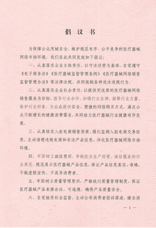 會上,參會的10家企業(yè)代表共同發(fā)起規(guī)范醫(yī)療器械網(wǎng)絡(luò)市場秩序倡議,并簽署倡議書,承諾將認真落實相關(guān)責(zé)任,以守法經(jīng)營為基準(zhǔn),自覺遵守法律法規(guī)要求,共同抵制各種違法違規(guī)行為;以提供更優(yōu)質(zhì)的醫(yī)療器械網(wǎng)絡(luò)銷售服務(wù)為目標(biāo),加強行業(yè)自律,共同營造醫(yī)療器械網(wǎng)絡(luò)銷售的良好環(huán)境,營造社會共治的良好氛圍,促進醫(yī)療器械產(chǎn)業(yè)高質(zhì)量健康發(fā)展。