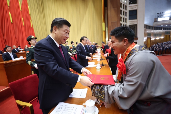 2月25日,全國脫貧攻堅總結表彰大會在北京人民大會堂隆重舉行。這是習近平為全國脫貧攻堅楷模榮譽稱號獲得者國網(wǎng)西藏電力有限公司農(nóng)電工作部頒獎。新華社記者 李學仁 攝