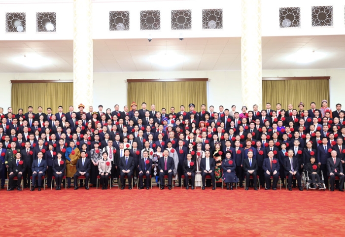 2月25日,全國脫貧攻堅總結表彰大會在北京人民大會堂隆重舉行。會前,習近平等會見全國脫貧攻堅楷模榮譽稱號獲得者,全國脫貧攻堅先進個人、先進集體代表,全國脫貧攻堅楷模榮譽稱號個人獲得者和因公犧牲全國脫貧攻堅先進個人親屬代表等,并同大家合影留念。新華社記者 鞠鵬 攝