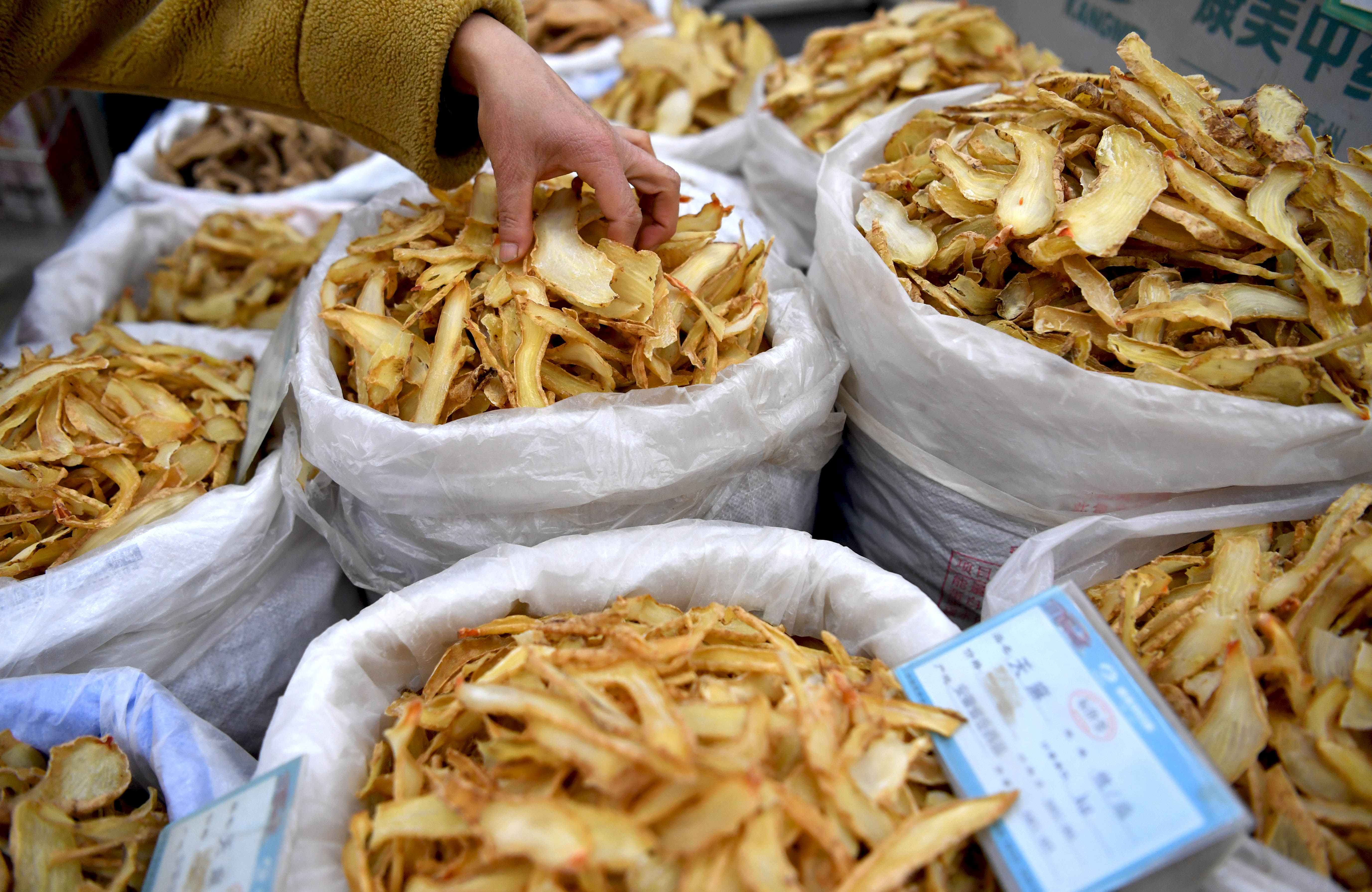 圖為3月1日,藥商在安徽省亳州中藥材專業(yè)市場內(nèi)選購藥材。(劉勤利 攝)