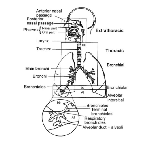 HRTM模型是由ICRP開發(fā),可用于估算呼吸道中吸入顆粒的沉積劑量。它是基于實(shí)驗(yàn)數(shù)據(jù)的半經(jīng)驗(yàn)?zāi)P?,用于在良好控制條件下的人體內(nèi)顆粒局部沉積。該模型將呼吸道分為兩個部分(見圖):胸外(ET)氣道和胸腔(TH)氣道。胸腔區(qū)域包括支氣管(BB:氣管,支氣管)、細(xì)支氣管(bb)、肺泡間質(zhì)區(qū)域(AI)(即氣體交換區(qū)域,氣道生成)和胸腔淋巴結(jié)。胸外區(qū)域是鼻前通道(ET1)、鼻后通道、咽和喉(ET2)以及胸外淋巴結(jié)。
