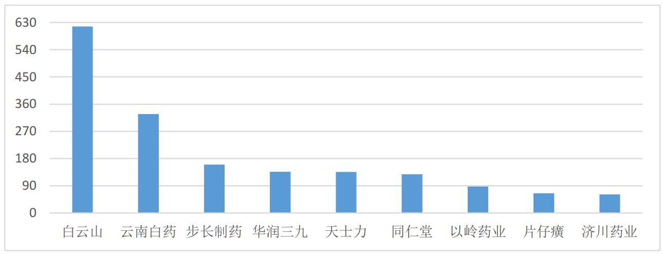 從總營收來看,如圖3所示,9家企業(yè)中,白云山總營收最高,達616.74億元,且超過第二名云南白藥近1倍,而云南白藥的總營收又是排名第三的步長制藥的1倍多。