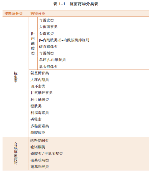 抗菌藥物分類如表1-1所示,其作用機(jī)制、抗菌譜、藥效學(xué)及藥代動(dòng)力學(xué)特點(diǎn)各有不同,在臨床使用也各有優(yōu)劣,應(yīng)掌握各類藥物特點(diǎn),合理使用。
