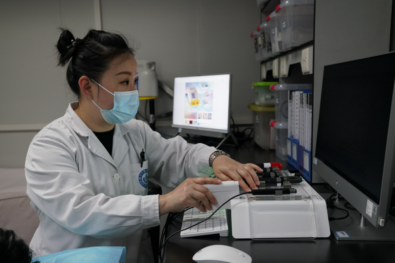 圖為實(shí)驗(yàn)室工作人員在使用無創(chuàng)測(cè)量?jī)x器測(cè)量皮膚生理參數(shù)。(實(shí)驗(yàn)室供圖)