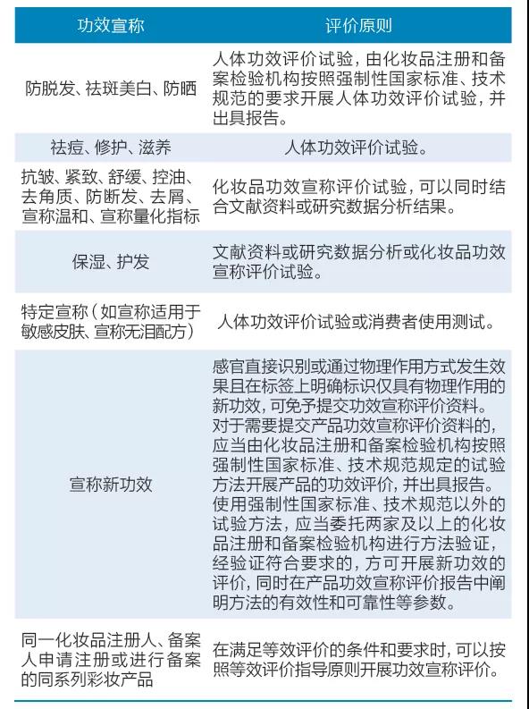 表1 化妝品功效宣稱(chēng)評(píng)價(jià)原則