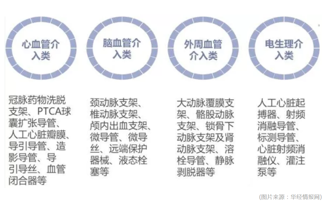 血管介入器械可分為心血管介入器械、腦血管介入器械、外周血管介入器械與電生理介入器械: