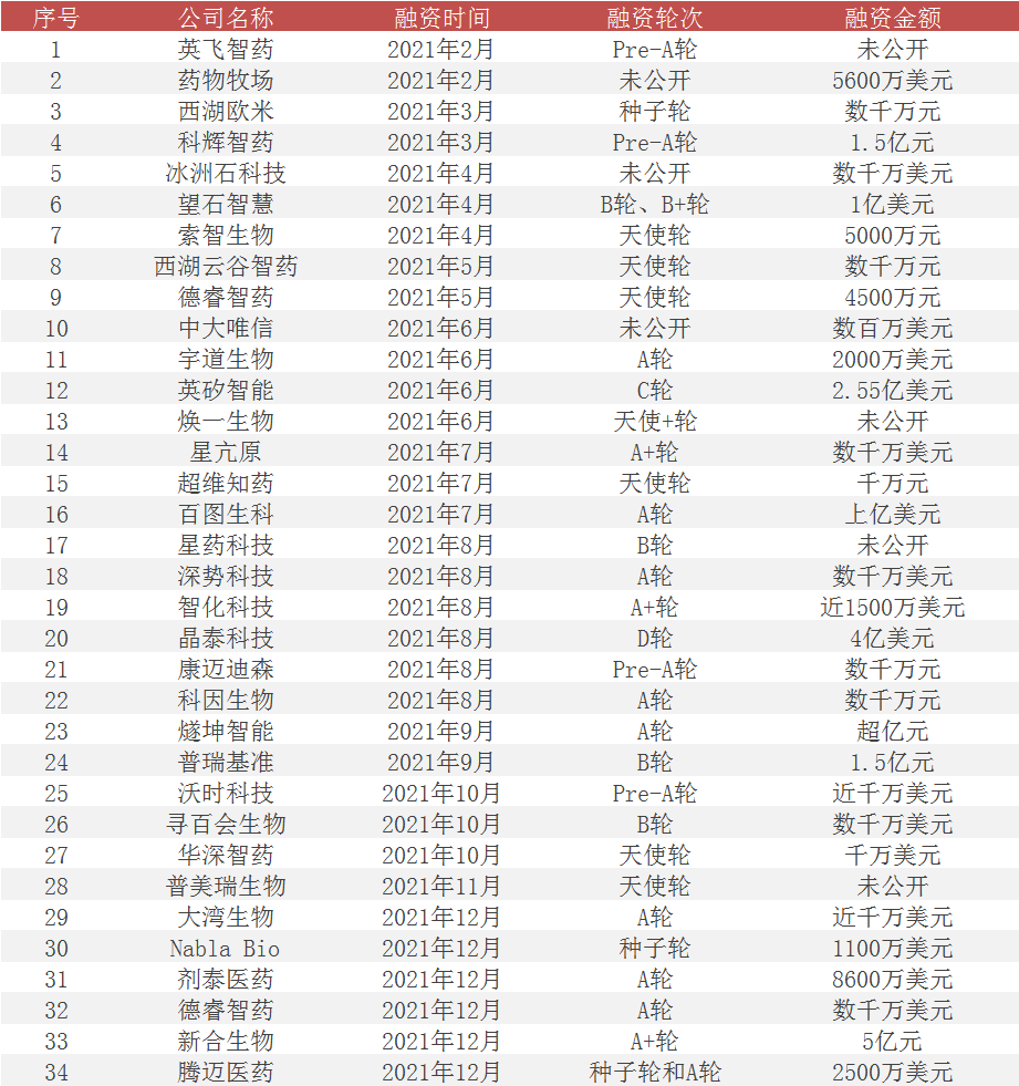 無論是“老兵”還是“新兵”,優(yōu)秀的AI制藥選手們都在資本市場上獲得了認可。據(jù)不完全統(tǒng)計,2021年,國內AI制藥領域共發(fā)生34起融資事件(其中3起融資事件未披露融資輪次,4起融資事件未披露融資金額),涉及融資總金額為834521.36萬元,平均單筆融資金額為24544.75萬元。
