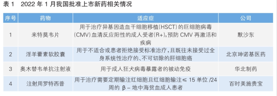 1月份,我國共批準4款新藥上市,其中淫羊藿素軟膠囊、奧木替韋單抗注射液為自主研發(fā)(詳見表1)。