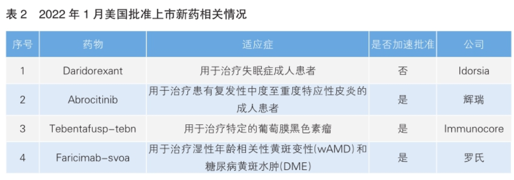 1月份,美國批準上市4款新藥,其中3款獲得加速批準。除Abrocitinib外,其余3款均為全球首次獲批(詳見表2)。