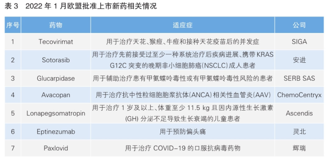 1月份,歐盟共批準7款新藥上市。根據(jù)Phar madigger數(shù)據(jù)庫信息,這7款新藥均不是全球首次獲批(詳見表3)。