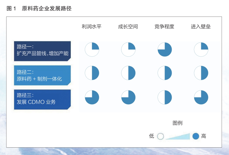 從需求端看,產(chǎn)能轉(zhuǎn)移、跨國企業(yè)產(chǎn)品本土化、集中帶量采購常態(tài)化和創(chuàng)新藥市場蓬勃發(fā)展等機(jī)遇,為原料藥企業(yè)提供了不同的發(fā)展思路(詳見圖1):一是繼續(xù)專注原料藥領(lǐng)域,擴(kuò)充產(chǎn)品管線,增加產(chǎn)能,降本增效;二是切入下游制劑市場,利用成本優(yōu)勢和帶量集采機(jī)會(huì),入局集采市場;三是憑借自身在生產(chǎn)端的規(guī)?;a(chǎn)經(jīng)驗(yàn)和成本控制能力,提升研發(fā)端能力,發(fā)展CDMO業(yè)務(wù)。