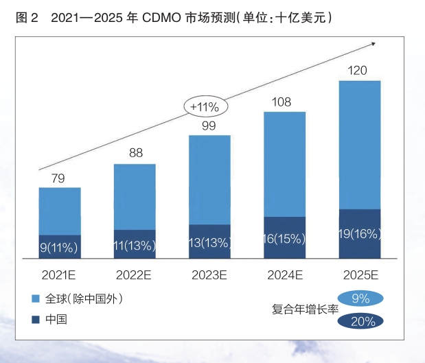 從國際市場來看,受到研發(fā)、環(huán)保、人力等成本上升壓力的影響,CDMO產(chǎn)業(yè)由歐美成熟市場逐漸向亞洲新興市場轉(zhuǎn)移。由于擁有數(shù)量可觀的人才以及潛力巨大的醫(yī)藥市場,中國占據(jù)了產(chǎn)業(yè)承接的“C位”,充分匹配CDMO產(chǎn)業(yè)的核心供需要素。艾昆緯預(yù)測,未來五年,中國CDMO產(chǎn)業(yè)市場將以約20%的復(fù)合年增長率高速增長,為全球增速的2倍(詳見圖2)。