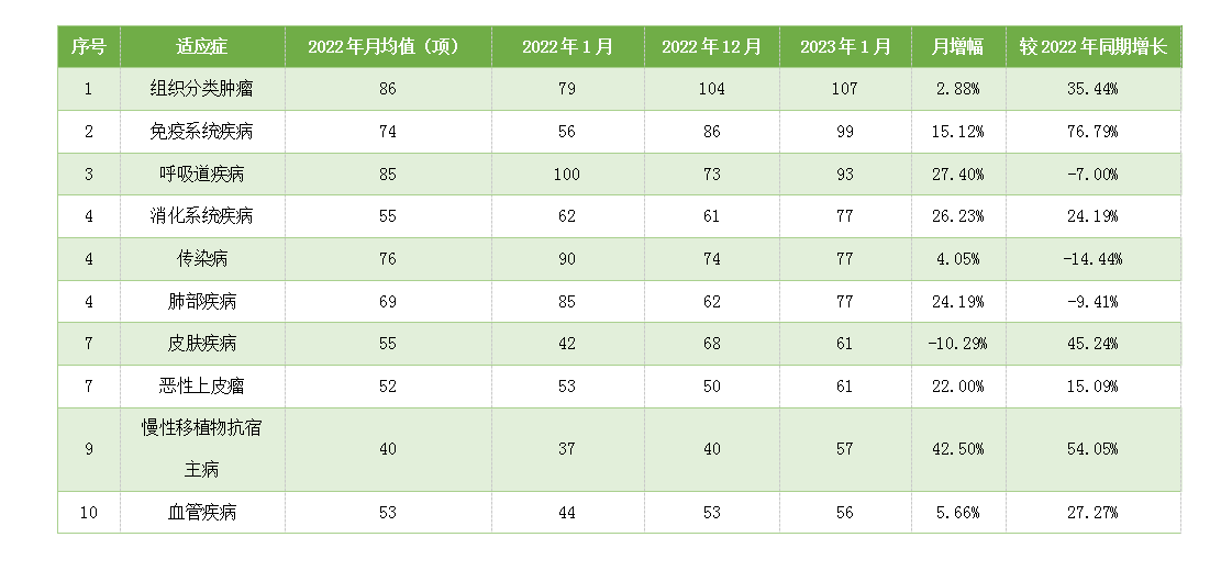 從1月份新增臨床試驗熱門適應(yīng)癥領(lǐng)域來看,組織分類腫瘤仍為最主要的熱門研發(fā)領(lǐng)域, 試驗數(shù)量為107項,相較12月份上升 2.88%;其次為免疫系統(tǒng)疾病,但數(shù)量相較于上月上升15.12%。月增幅最高的熱門適應(yīng)癥為慢性移植物抗宿主病,單月增幅均超過40%。僅有皮膚類疾病本月相較上月下降,下降幅度為10.29%。(詳見表1)