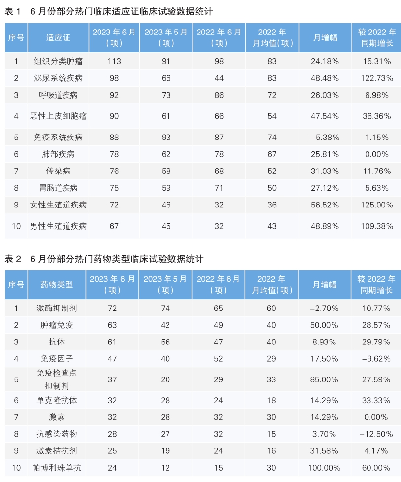 這是泌尿系統(tǒng)疾病首次進(jìn)入熱門適應(yīng)證領(lǐng)域前三,男性及女性生殖道疾病首次進(jìn)入熱門適應(yīng)證領(lǐng)域前十。相較于2022年同期,女性生殖道疾病領(lǐng)域新開臨床試驗(yàn)增長125%,男性生殖道疾病領(lǐng)域新開臨床試驗(yàn)增長109.38%,整體增長122.73%。6月份熱門適應(yīng)證臨床試驗(yàn)數(shù)量相較于上月僅有免疫系統(tǒng)疾病領(lǐng)域出現(xiàn)下降,月降幅僅為5.38%,但相較于2022年同期仍有增長。肺部疾病是本月熱門適應(yīng)證中唯一未增長領(lǐng)域。(詳見表1)