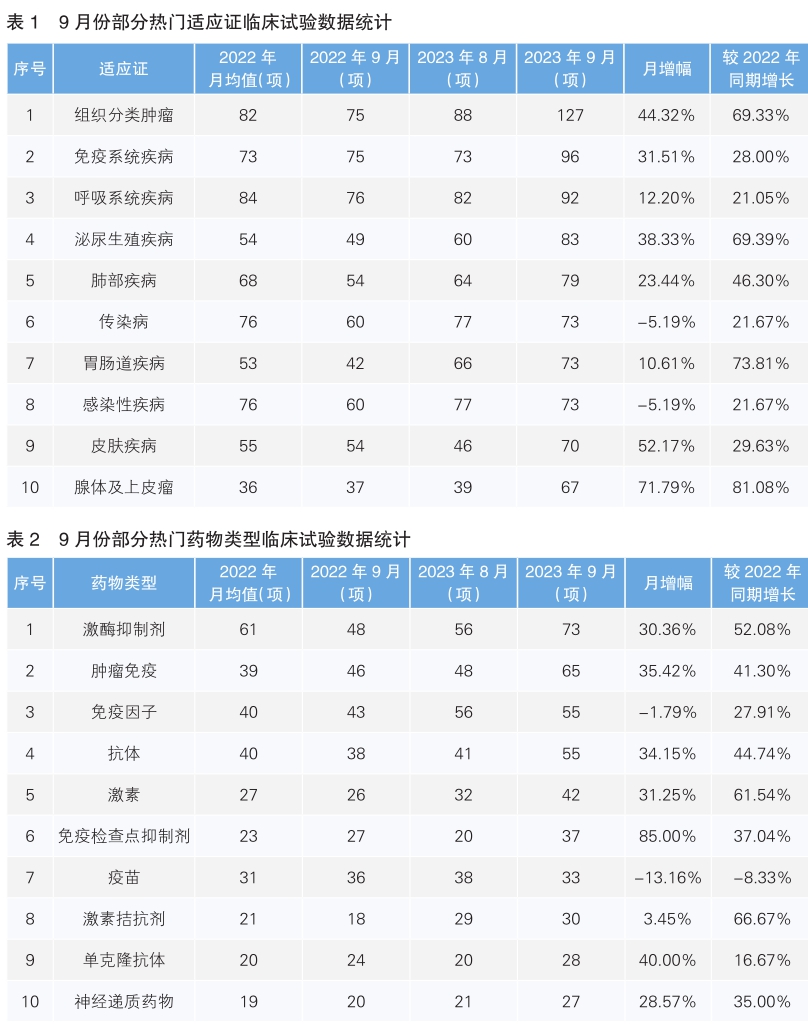 對新開臨床試驗藥物類型進(jìn)行統(tǒng)計后發(fā)現(xiàn),9月份最為熱門的藥物類型仍為激酶抑制劑,相較于上月增長了30.36%,相較于2022年同期增長了52.08%;其次為腫瘤免疫藥物,環(huán)比增幅為35.42%,同比增幅為41.3%。月增幅最高的藥物類型是單克隆抗體,月增幅為40%,相較于2022年同期增長16.67%(詳見表2)。