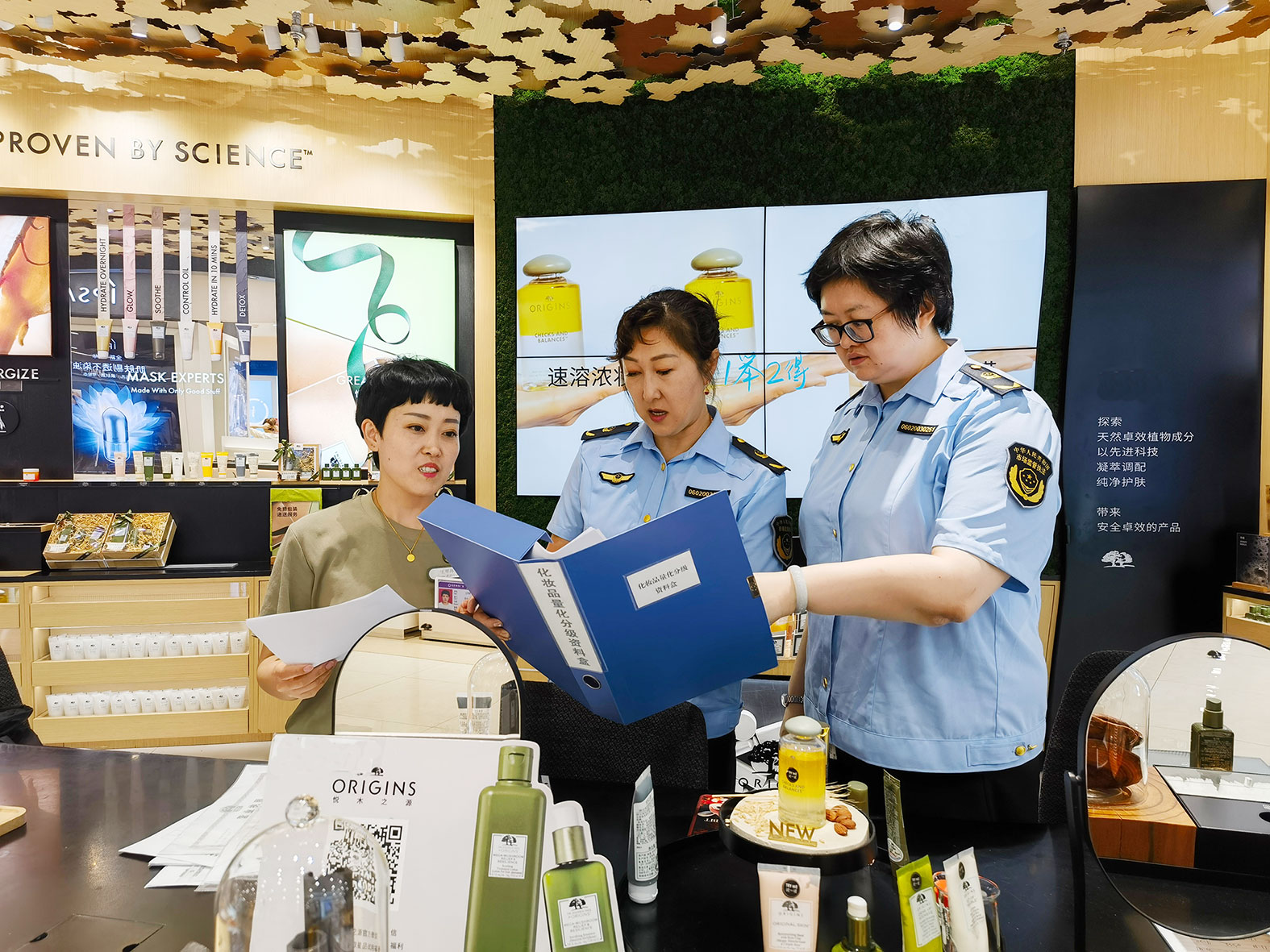 圖為大連市市場(chǎng)監(jiān)管局監(jiān)管人員在一家化妝品商城開(kāi)展檢查并進(jìn)行量化分級(jí)評(píng)定。劉笑英 攝