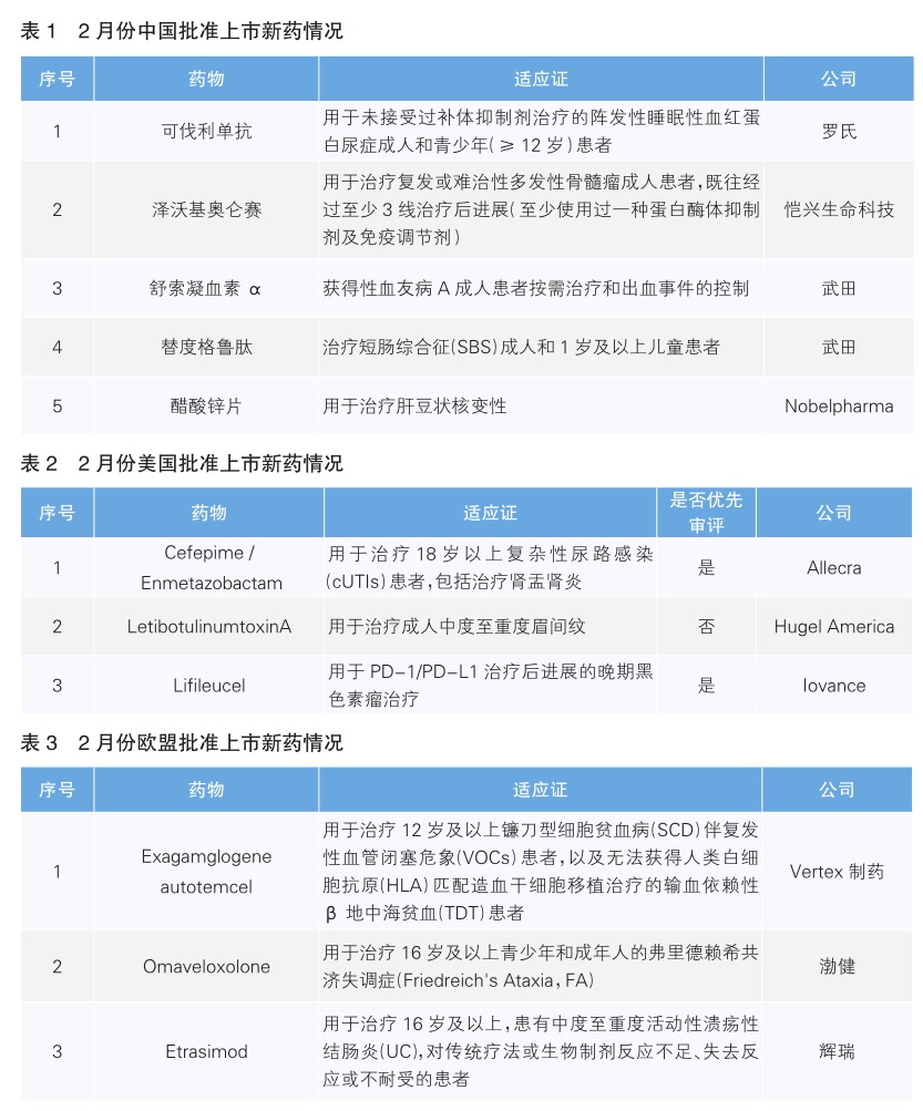 2月份,我國批準(zhǔn)了5款新藥上市。根據(jù)Pharmadigger數(shù)據(jù)庫,當(dāng)月全球范圍內(nèi)首次獲批上市新藥為可伐利單抗和澤沃基奧侖賽(詳見表1)。
