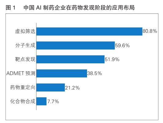 近年來,隨著基因組測序工程的快速進展、二代測序技術(shù)的快速普及、人工智能技術(shù)的進步和高性能計算機的發(fā)展,AI制藥應(yīng)運而生,發(fā)展迅速。從制藥流程來看,AI技術(shù)已滲透到包括靶點發(fā)現(xiàn)、化合物合成和篩選、晶型預(yù)測、機制探索、選擇受試人群、藥物警戒等多個環(huán)節(jié)。相較于傳統(tǒng)藥物研發(fā),AI技術(shù)能將藥物發(fā)現(xiàn)、臨床前研究的時間縮短近40%,新藥研發(fā)成功率可從12%提高到約14%。中國AI制藥企業(yè)在藥物發(fā)現(xiàn)階段的應(yīng)用布局涉及虛擬篩選、分子生成等領(lǐng)域。(詳見圖1)