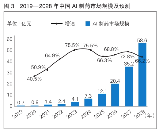 據(jù)頭豹研究院數(shù)據(jù),2019—2023年,中國AI制藥市場規(guī)模由7000萬元增加至4.1億元,年復(fù)合增速達57.4%。預(yù)計2024—2028年,市場規(guī)模將由7.3億元增加至58.6億元,年復(fù)合增速達68.5%。(詳見圖3)