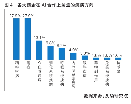 各大藥企在AI制藥合作項目上,聚焦的病種廣泛分布在抗腫瘤、呼吸系統(tǒng)、抗感染等多個領(lǐng)域,其中大型藥企在癌癥和精神疾病領(lǐng)域的合作項目占比最高,均為27.9%,其次為心血管疾病,占比13.1%。(詳見圖4)