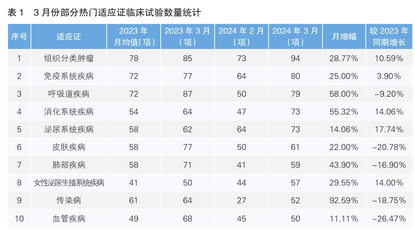 從3月份新增臨床試驗熱門適應(yīng)證領(lǐng)域來看,組織分類腫瘤仍為最主要的熱門研發(fā)領(lǐng)域,試驗數(shù)量為94項,相較2月份增長28.77%;其次為免疫系統(tǒng)疾病,環(huán)比增長25%。月增幅最高的熱門適應(yīng)證為傳染病,單月增幅為92.59%。月增幅最低的熱門適應(yīng)證為血管疾病,單月增幅為11.11%。相較于2023年同期,同比增幅最為顯著的為泌尿系統(tǒng)疾病,增長17.74%;同比降幅最為顯著的是血管疾病,降幅為26.47%。(詳見表1)