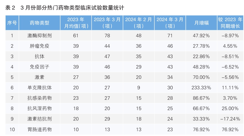 對新增臨床試驗藥物類型進行統(tǒng)計后發(fā)現(xiàn),3月份最為熱門的藥物類型仍為激酶抑制劑,環(huán)比增長47.92%,但同比下降了8.97%;其次為腫瘤免疫藥物,環(huán)比增長27.78%,同比增長4.55%。月增幅最高的藥物類型為單克隆抗體藥物,增幅為233.33%,同比增長了11.11%。相較于2023年同期月降幅最大的藥物類型是激素拮抗劑,同比下降了17.24%。(詳見表2)