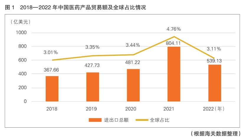 聯(lián)合國有關(guān)機構(gòu)統(tǒng)計數(shù)據(jù)顯示,2018—2022年的五年間,中國醫(yī)藥產(chǎn)品貿(mào)易總額由367.66億美元升至539.13億美元,全球占比穩(wěn)定在3.5%左右,全球排名由第十位升至第九位(詳見圖1)。