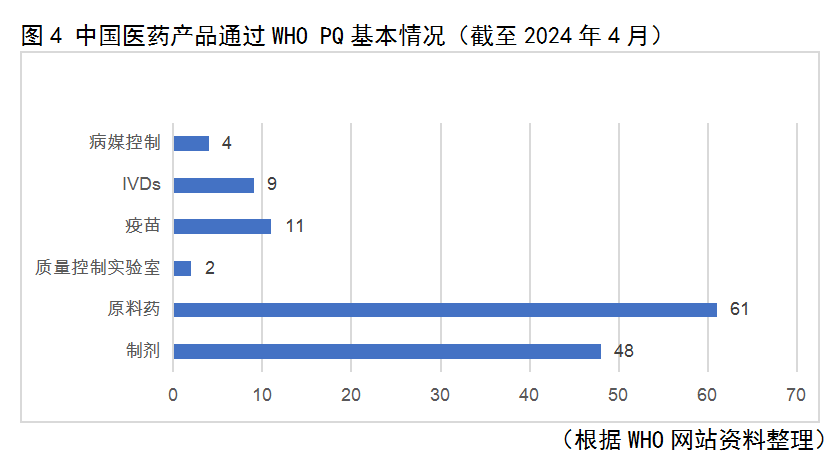 作為全球第一大原料藥生產(chǎn)國,據(jù)統(tǒng)計,2015—2021年,中國原料藥企業(yè)共獲得707個歐盟CEP證書(歐洲藥典適應(yīng)性證書),居全球第二位;截至2023年7月,在美國獲DMF(藥物管理檔案)注冊3743個。在創(chuàng)新藥領(lǐng)域,截至2023年底,已有8款國產(chǎn)創(chuàng)新藥成功闖關(guān)美國。同時,中國醫(yī)藥產(chǎn)品在參與世界衛(wèi)生組織預(yù)認證(WHO PQ)方面也取得了不錯成績(詳見圖4)。