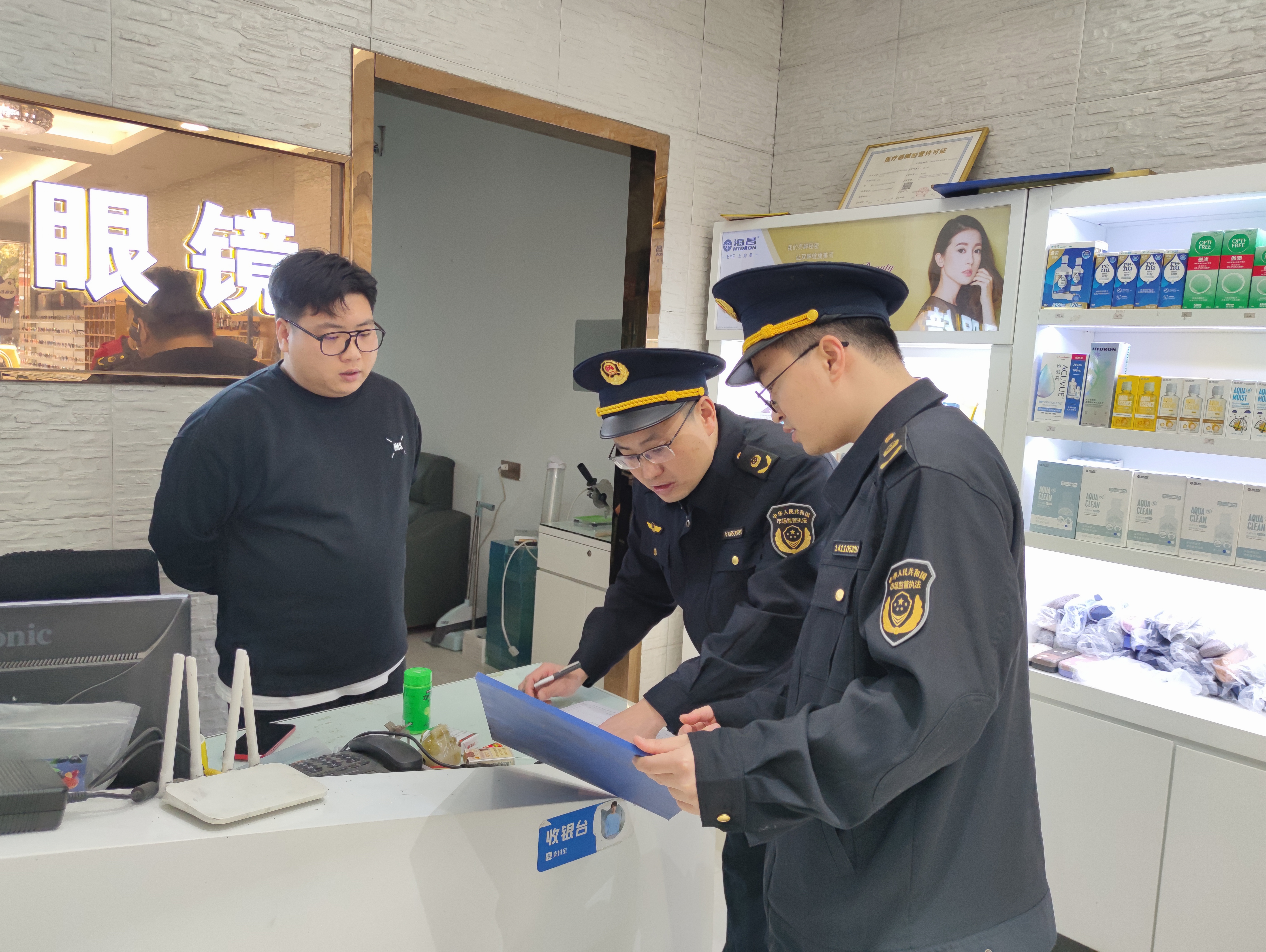 圖為執(zhí)法人員在一家眼鏡店開展隱形眼鏡執(zhí)法檢查。(鄢國卿攝)
