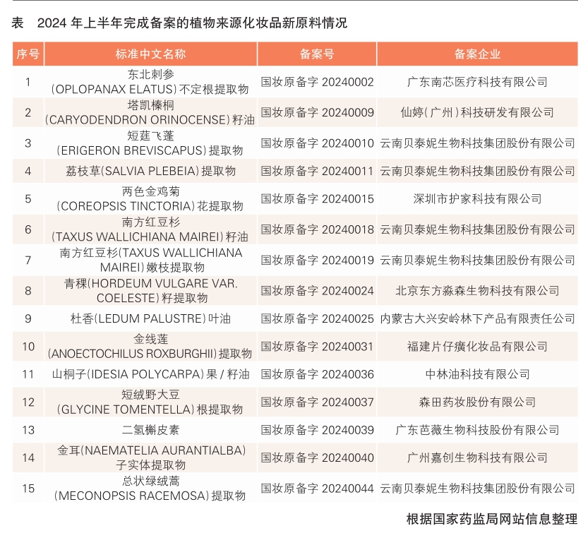 對備案化妝品新原料的來源進行統(tǒng)計分析發(fā)現(xiàn),上半年,植物來源的化妝品新原料占比進一步提升,是高頻備案新原料類型之一,共有15款植物來源的新原料完成備案,占比近三成。如,東北刺參(OPLOPANAXELATUS)不定根提取物、塔凱榛桐(CARYODENDRONORINOCENSE)籽油、短莛飛蓬(ERIGERONBREVISCAPUS)提取物等(詳見表)。