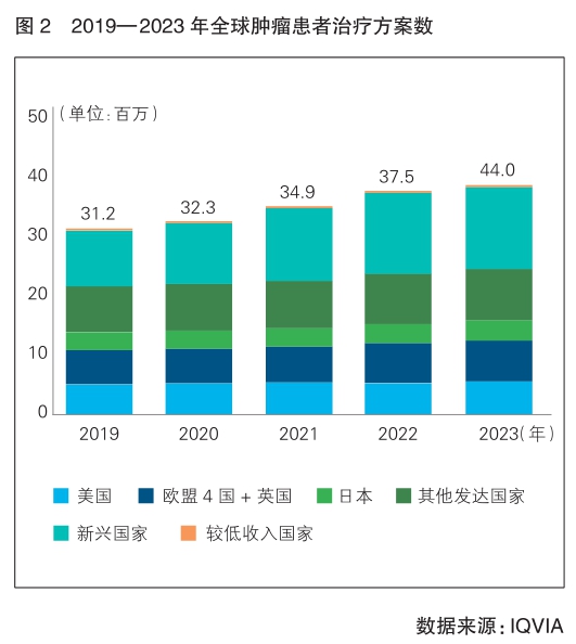 癌癥發(fā)病率的增加和醫(yī)療服務(wù)的普及推動(dòng)了發(fā)達(dá)市場(chǎng)癌癥治療水平的穩(wěn)步提高。隨著低收入國(guó)家醫(yī)療服務(wù)的普及以及治療時(shí)間的延長(zhǎng),每年接受治療的癌癥患者人數(shù)不斷增加,過去五年中,全球癌癥治療方案數(shù)量平均每年增長(zhǎng)9%。發(fā)達(dá)市場(chǎng)的人均治療率仍然最高,平均是低收入市場(chǎng)和新興市場(chǎng)的五倍多。(詳見圖2)