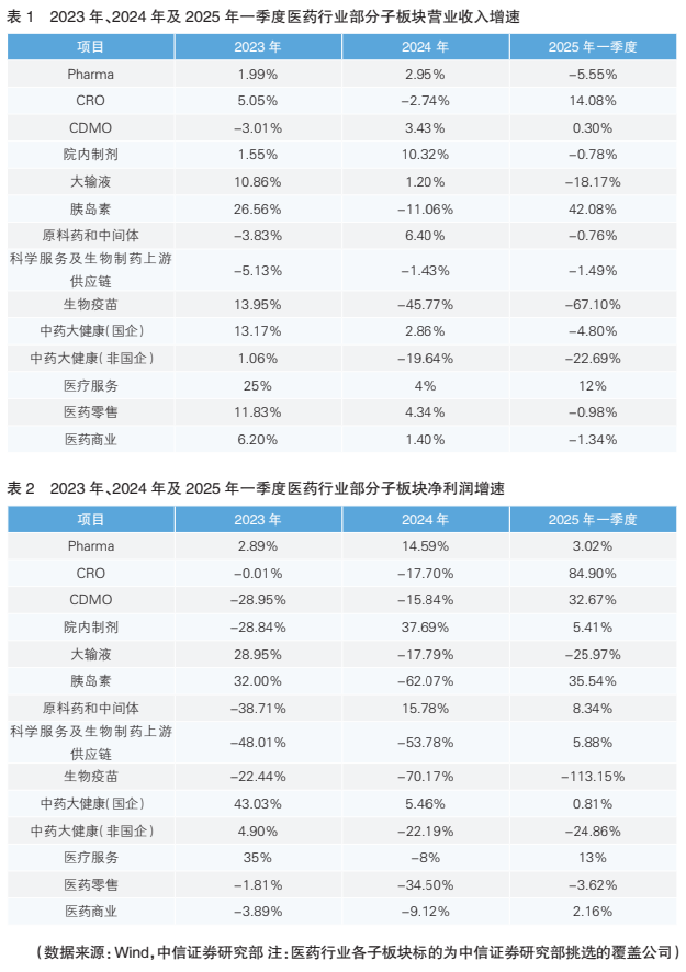盡管2024年和2025年一季度醫(yī)藥板塊整體業(yè)績(jī)承壓,但部分子板塊成績(jī)亮眼,呈現(xiàn)出向好的潛力。(詳見(jiàn)表1、表2)