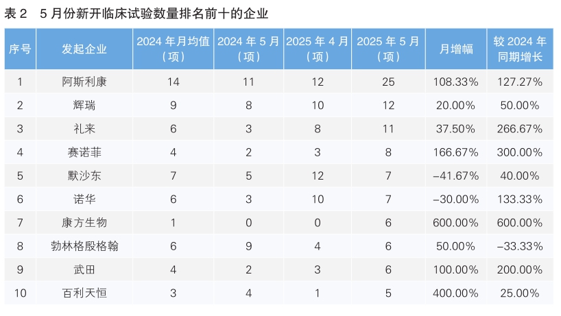 對(duì)新開臨床試驗(yàn)的發(fā)起企業(yè)進(jìn)行統(tǒng)計(jì)后發(fā)現(xiàn),5月份發(fā)起臨床試驗(yàn)最多的企業(yè)為阿斯利康,新開臨床試驗(yàn)25項(xiàng),環(huán)比上升108.33%,同比上升127.27%;其次為輝瑞,新開臨床試驗(yàn)12項(xiàng),環(huán)比上漲20%,同比增長(zhǎng)50%。新開臨床試驗(yàn)數(shù)量上升幅度最大的企業(yè)為康方生物,與其4月份相比上升了6倍。值得注意的是,這也是我國企業(yè)康方生物首次進(jìn)入新開臨床試驗(yàn)數(shù)量排名前十榜單。(詳見表2)