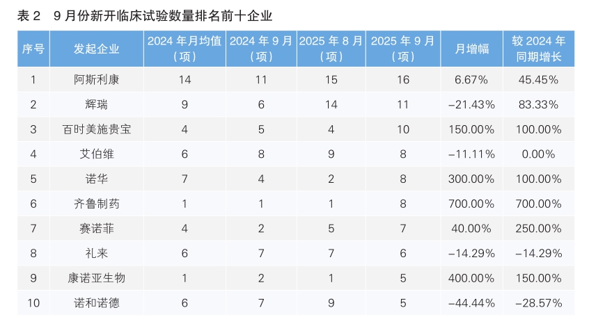對(duì)新開(kāi)臨床試驗(yàn)的發(fā)起企業(yè)進(jìn)行統(tǒng)計(jì)后發(fā)現(xiàn),9月份發(fā)起臨床試驗(yàn)最多的企業(yè)為阿斯利康,新開(kāi)臨床試驗(yàn)16項(xiàng),環(huán)比上升6.67%,同比上升45.45%。其次為輝瑞,新開(kāi)臨床試驗(yàn)11項(xiàng),環(huán)比下降21.42%,同比增長(zhǎng)83.33%。值得注意的是,9月份我國(guó)藥企齊魯制藥和康諾亞生物進(jìn)入新開(kāi)臨床試驗(yàn)數(shù)量排名前十榜單,分別新開(kāi)8項(xiàng)和5項(xiàng)臨床試驗(yàn)。其中,齊魯制藥為新開(kāi)臨床試驗(yàn)數(shù)量上升幅度最大的企業(yè),與8月份相比上升了7倍。(詳見(jiàn)表2)