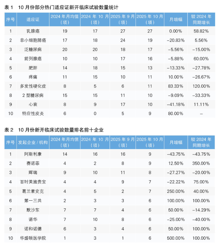 從10月份新開(kāi)臨床試驗(yàn)熱門(mén)適應(yīng)證來(lái)看,乳腺癌為最主要的熱門(mén)研發(fā)領(lǐng)域,新開(kāi)臨床試驗(yàn)27項(xiàng),環(huán)比持平,同比上漲58.82%。其次為非小細(xì)胞肺癌,新開(kāi)臨床試驗(yàn)19項(xiàng),環(huán)比下降20.83%,同比上漲5.56%。值得注意的是,10月份新開(kāi)臨床試驗(yàn)數(shù)量上升幅度最大的熱門(mén)適應(yīng)證為多發(fā)性硬化癥,由9月份的6項(xiàng)上升至11項(xiàng),上升幅度為83.33%;新開(kāi)臨床試驗(yàn)數(shù)量下降幅度最大的適應(yīng)證為心衰,由9月份的17項(xiàng)下降到10項(xiàng),下降幅度為41.18%。(詳見(jiàn)表1)
