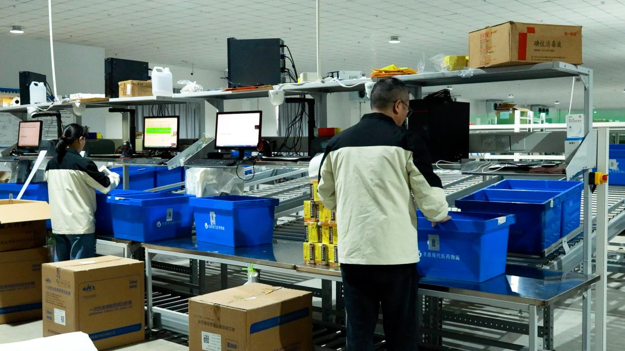 圣晨醫(yī)藥物流倉庫,工作人員正在對分揀的藥品掃描電子監(jiān)管碼