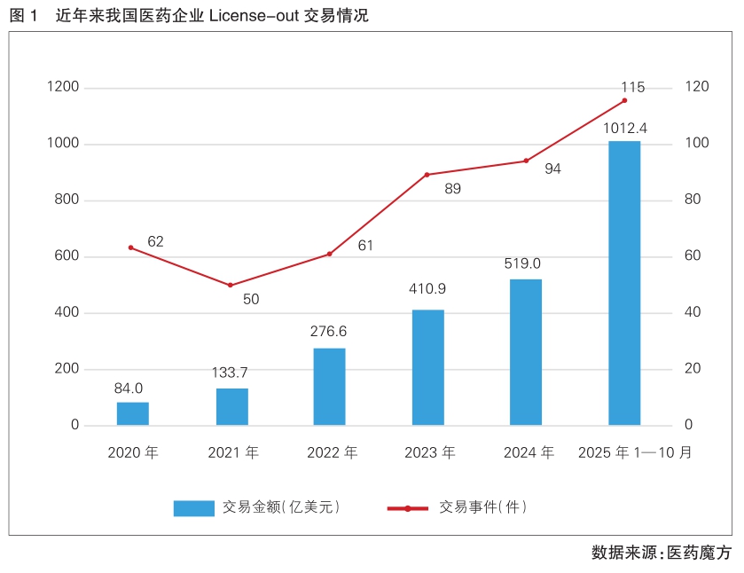我國(guó)醫(yī)藥產(chǎn)業(yè)在“十四五”期間持續(xù)加大研發(fā)投入,創(chuàng)新能力顯著提升,正逐步從仿制藥大國(guó)向創(chuàng)新藥強(qiáng)國(guó)邁進(jìn)。產(chǎn)品研發(fā)方面,一批具有重要臨床價(jià)值的創(chuàng)新藥和醫(yī)療器械成功上市,覆蓋抗腫瘤、心血管、神經(jīng)系統(tǒng)等多個(gè)疾病治療領(lǐng)域。Pharmaprojects數(shù)據(jù)庫(kù)今年發(fā)布的《2025年醫(yī)藥研發(fā)年度回顧》顯示,中美兩國(guó)領(lǐng)跑全球醫(yī)藥創(chuàng)新研發(fā)。其中,美國(guó)仍處于全球醫(yī)藥創(chuàng)新的中心地位,參與研發(fā)的藥物數(shù)量達(dá)11455個(gè),占比48.0%;中國(guó)保持快速追趕態(tài)勢(shì),研發(fā)項(xiàng)目數(shù)量達(dá)7032個(gè),占比29.5%,較2023年的26.7%提升近3個(gè)百分點(diǎn)。中美兩國(guó)新藥研發(fā)數(shù)量差距已縮小至不足200個(gè),而5年前差距尚達(dá)數(shù)千項(xiàng)。研發(fā)平臺(tái)方面,基因工程、蛋白質(zhì)工程、高通量篩選等先進(jìn)技術(shù)廣泛應(yīng)用于新藥研發(fā),有效縮短了研發(fā)周期、提高了研發(fā)效率。研發(fā)合作機(jī)制方面,產(chǎn)學(xué)研協(xié)同不斷深化,企業(yè)、高校、科研機(jī)構(gòu)之間形成良好創(chuàng)新協(xié)同機(jī)制,加速了科技成果轉(zhuǎn)化。在BD(商務(wù)拓展)交易領(lǐng)域,中國(guó)已成為全球醫(yī)藥BD交易的主要參與國(guó)之一。根據(jù)醫(yī)藥魔方數(shù)據(jù),2025年1—10月,我國(guó)醫(yī)藥企業(yè)License-out交易總額突破1000億美元,是2020年全年的10倍以上(詳見(jiàn)圖1)。
