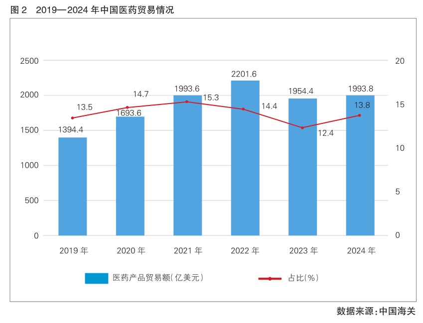 貿(mào)易方面,根據(jù)中國(guó)海關(guān)數(shù)據(jù),我國(guó)醫(yī)藥產(chǎn)品貿(mào)易額從2019年的1394.4億美元增至2024年的1993.8億美元(詳見(jiàn)圖2)。另?yè)?jù)聯(lián)合國(guó)貿(mào)易數(shù)據(jù)庫(kù)(UN Comtrade)統(tǒng)計(jì)數(shù)據(jù),2024年中國(guó)藥品進(jìn)出口總額為545.6億美元,位居全球第十,與美國(guó)(3070.5億美元)、德國(guó)(2062.8億美元)、瑞士(1781.1億美元)和愛(ài)爾蘭(1064.3億美元)等傳統(tǒng)醫(yī)藥強(qiáng)國(guó)相比仍存在差距。隨著我國(guó)醫(yī)藥產(chǎn)業(yè)的持續(xù)發(fā)展,醫(yī)藥產(chǎn)品出口規(guī)模預(yù)計(jì)將保持穩(wěn)定增長(zhǎng),出口結(jié)構(gòu)也將進(jìn)一步優(yōu)化,高附加值的創(chuàng)新藥和醫(yī)療器械產(chǎn)品出口占比有望顯著提高。出口市場(chǎng)將更趨多元化,在鞏固發(fā)展中國(guó)家市場(chǎng)的同時(shí),逐步擴(kuò)大在歐美等發(fā)達(dá)國(guó)家和地區(qū)的市場(chǎng)占有率。