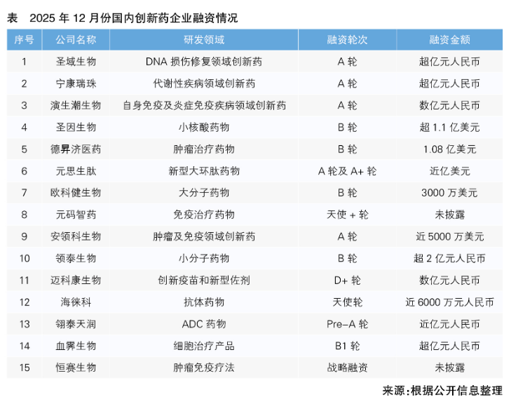2025年12月份15家國(guó)內(nèi)創(chuàng)新藥企業(yè)完成新一輪融資 最高單筆融資超1.1億美元,涉及小核酸藥物等研發(fā)領(lǐng)域