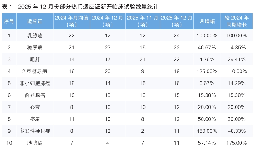 從2025年12月份新開臨床試驗適應(yīng)證來看,乳腺癌為最熱門的研發(fā)領(lǐng)域,新開臨床試驗24項,環(huán)比同比均翻一番。值得一提的是,2025年12月份針對熱門適應(yīng)證新開臨床試驗數(shù)量環(huán)比均呈上升趨勢,其中多發(fā)性硬化癥上升幅度最大,新開臨床試驗11項,環(huán)比增長450%。(詳見表1)
