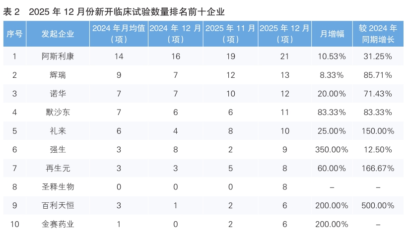 對新開臨床試驗的發(fā)起單位進(jìn)行統(tǒng)計后發(fā)現(xiàn),2025年12月份發(fā)起臨床試驗最多的企業(yè)是阿斯利康,新開臨床試驗21項,環(huán)比上升了10.53%,同比增長了31.25%。其次為輝瑞,新開臨床試驗13項,環(huán)比上升了8.33%,同比增長了85.71%。新開臨床試驗數(shù)量上升幅度最大的企業(yè)為強(qiáng)生,環(huán)比上升350%。值得注意的是,2025年12月份我國藥企圣釋生物、百利天恒和金賽藥業(yè)進(jìn)入新開臨床試驗數(shù)量排名前十榜單,分別新開臨床試驗8項、6項、6項。(詳見表2)