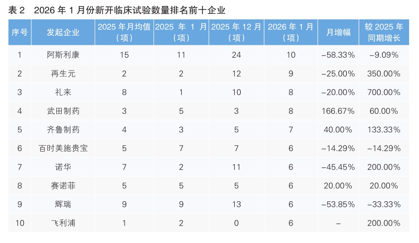 對(duì)新開臨床試驗(yàn)的發(fā)起單位進(jìn)行統(tǒng)計(jì)后發(fā)現(xiàn),1月份發(fā)起臨床試驗(yàn)最多的企業(yè)是阿斯利康,新開臨床試驗(yàn)10項(xiàng),環(huán)比下降了58.33%。其次為再生元,新開臨床試驗(yàn)9項(xiàng),環(huán)比下降了25%。新開臨床試驗(yàn)數(shù)量上升幅度最大的企業(yè)為武田制藥,環(huán)比上升了166.67%。值得注意的是,1月份我國(guó)藥企齊魯制藥進(jìn)入新開臨床試驗(yàn)數(shù)量排名前十榜單,新開臨床試驗(yàn)7項(xiàng),環(huán)比增長(zhǎng)40.00%,同比增長(zhǎng)133.33%。(詳見表2)