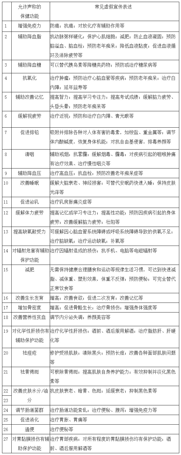 保健食品生產(chǎn)經(jīng)營(yíng)者應(yīng)嚴(yán)格按照注冊(cè)或備案的保健功能進(jìn)行標(biāo)簽標(biāo)識(shí)和宣傳表述。我們整理了市場(chǎng)上針對(duì)監(jiān)管部門批準(zhǔn)的27類保健功能的虛假宣傳表述(詳見附表)。凡有這些虛假宣傳表述的產(chǎn)品,無論是在商超等線下實(shí)體店銷售,還是通過網(wǎng)絡(luò)、會(huì)議、電視、廣播、電話和報(bào)刊等方式銷售,請(qǐng)消費(fèi)者都不要購(gòu)買,同時(shí)可以撥打熱線電話12331、12315進(jìn)行投訴舉報(bào)。