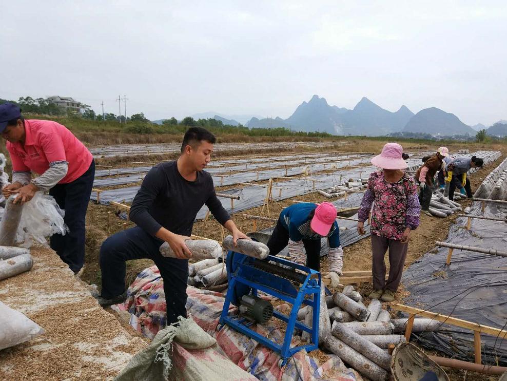鐘山縣食品藥品監(jiān)管局駐燕塘鎮(zhèn)聚義村第一書記黃升棟,想方設(shè)法幫農(nóng)戶創(chuàng)業(yè),助其致富。下圖為近日黃升棟(左二)和農(nóng)戶一起給黑木耳棒扎孔下地。 鐘人木 攝影報(bào)道