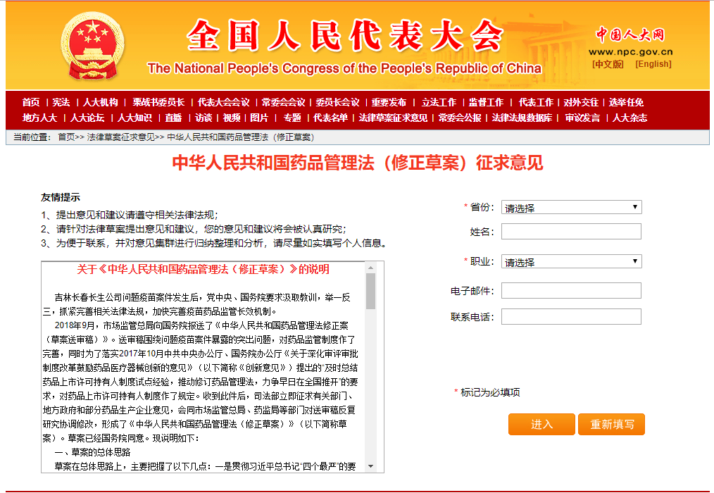 11月1日,《藥品管理法》修正草案在中國人大網(wǎng)公布,開始公開征求社會各界意見,征求意見截至?xí)r間為2018年12月1日。