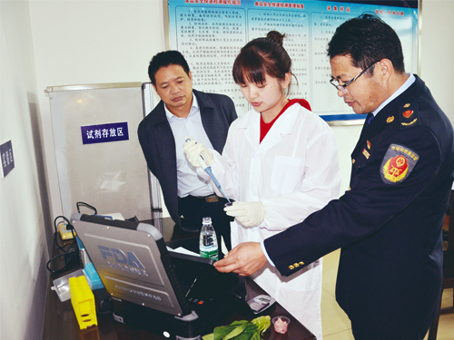 為確保轄區(qū)中小學、幼兒園食堂和配餐中心、農(nóng)貿(mào)市場的食品安全,近期,江西省于都縣市場監(jiān)管局在食品安全監(jiān)測中使用了新型食品快速檢測儀器,能在幾分鐘內(nèi)檢測出蔬菜農(nóng)藥殘留、食品亞硝酸鹽含量、食用油是否安全達標以及餐具清潔消毒情況等。 圖為近日該局梓山分局的檢測人員快檢蔬菜農(nóng)殘情況。 王雨林 王繼洪 攝影報道