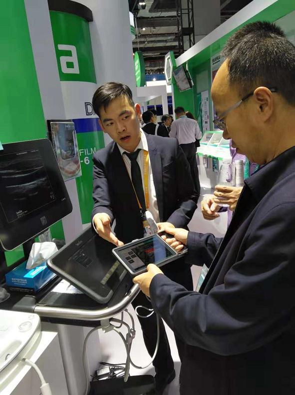 日本富士集團(tuán),作為一個(gè)以相機(jī)和膠片而被人熟知的企業(yè),在醫(yī)療器械領(lǐng)域也頗有建樹。這次展會(huì)上,富士集團(tuán)帶來(lái)的手持式彩色超聲診斷儀吸引了諸多參展觀眾駐足圍觀。記者也上前體驗(yàn)了一把,診斷儀重量接近平板電腦,手柄端直接接觸要測(cè)的身體部位,然后診斷儀就會(huì)清晰地顯示出圖像。展臺(tái)工作人員告訴記者,手持式彩色超聲診斷儀使用方便,尤其適用于急救等場(chǎng)合,醫(yī)護(hù)人員可隨時(shí)隨地獲知患者血管狀況。